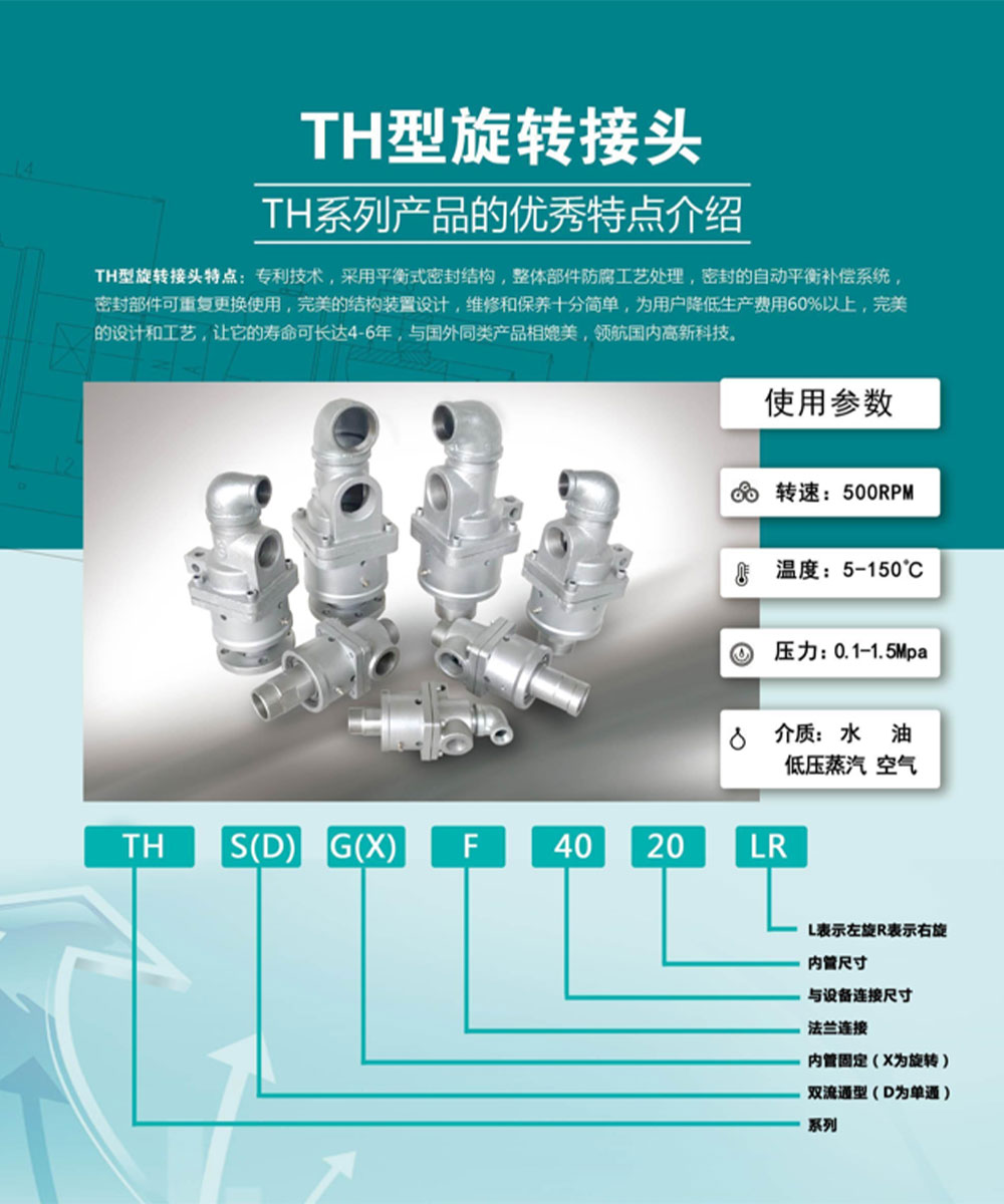Characteristics of TH type rotary joint: patented technology, adopting a balanced sealing structure, anti-corrosion treatment of the overall components, and automatic balance compensation system for sealing The sealing components can be repeatedly replaced and used, and the perfect structural device design makes maintenance and repair very simple, reducing production costs for users by more than 60%. Perfect The design and craftsmanship of the product enable it to have a lifespan of up to 4-6 years, comparable to similar foreign products, leading the domestic high-tech industry.