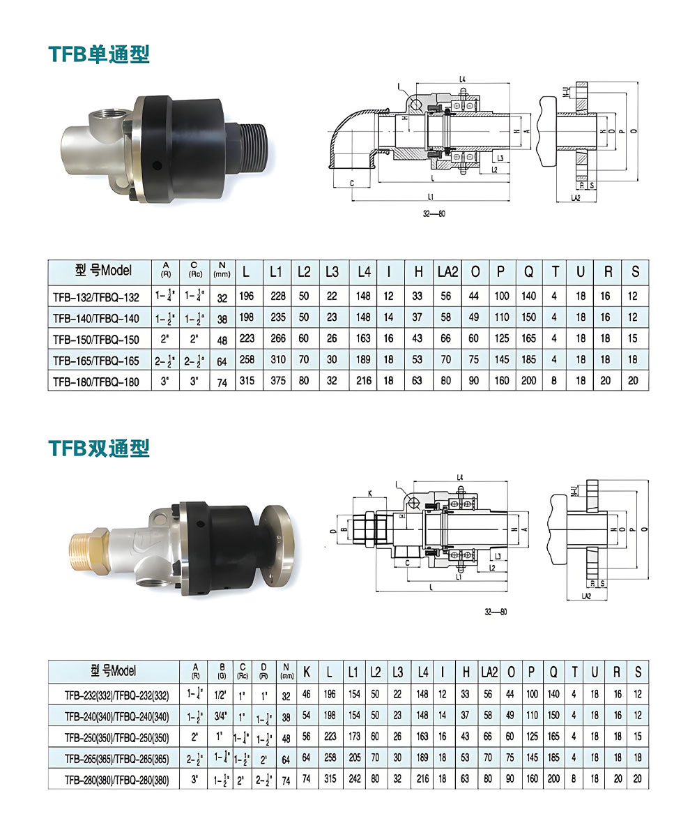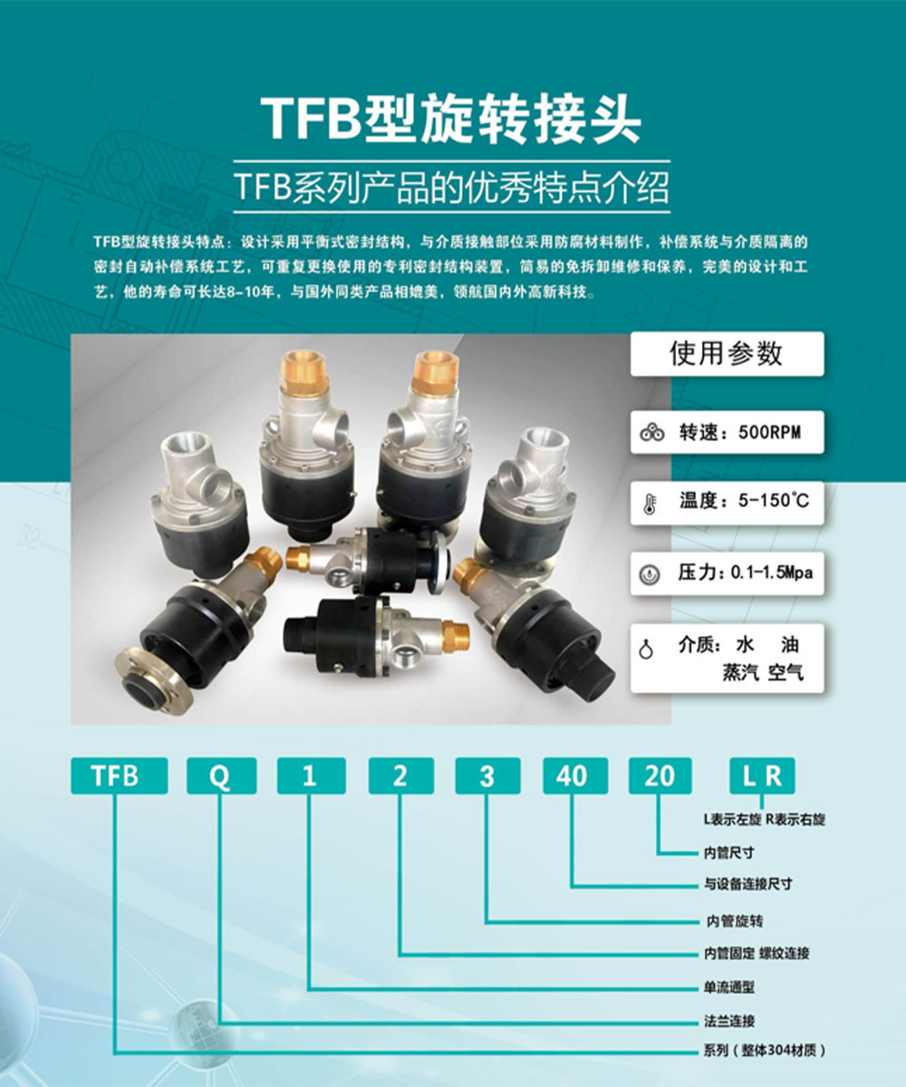TFU type rotary joint features: a high-pressure, high-temperature rotary joint specially designed for vulcanization equipment, patented technology, using a spherical 360 degree rotary sealing structure The material selection includes stainless steel and die cast copper, optimized material matching design, precise sealing selection, adaptability to high temperature and high pressure of steam, and a stable compensation system for sealing More reliable performance and effectiveness, simple maintenance and upkeep operations, perfect design and craftsmanship, comparable to similar foreign products, leading the domestic high-tech industry